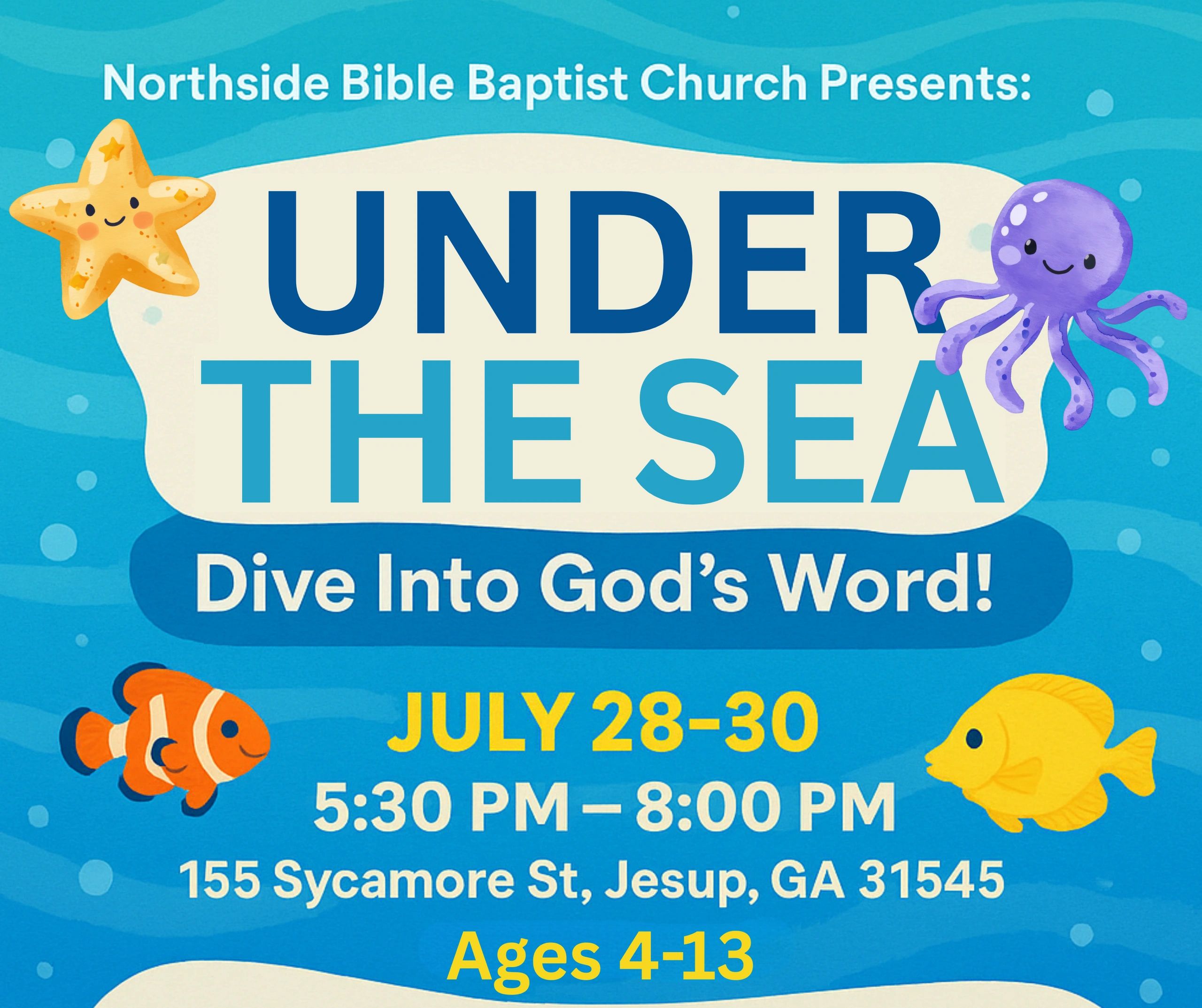 Join us for an unforgettable Under the Sea Vacation Bible School, where kids will explore the depths of God’s love through exciting lessons, fun games, yummy snacks and lively music!